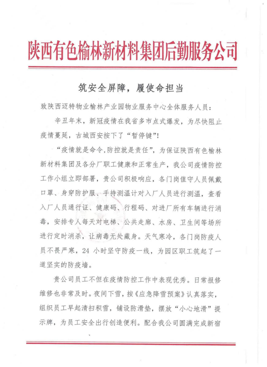 新材料后勤服務(wù)公司的致謝,是對園區(qū)物業(yè)服務(wù)工作的肯定,也是對物業(yè)員工的鼓舞。邁特物業(yè)員工紛紛表示:有付出就有收獲,將更加細(xì)化物業(yè)服務(wù)工作,進(jìn)一步提高服務(wù)品質(zhì),為榆林新材料職工創(chuàng)造舒適、安全、美好的生活環(huán)境。