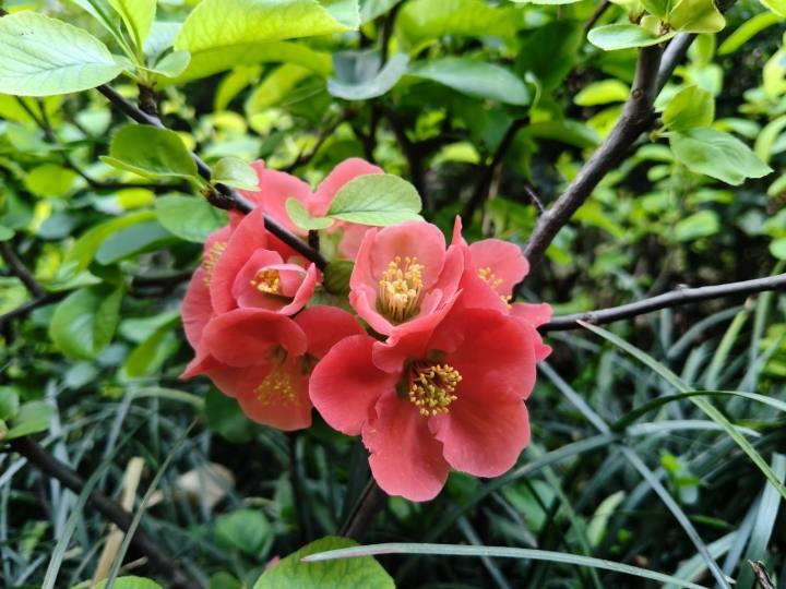 我不由自主地放慢腳步,湊近細(xì)賞,只見那貼梗而生的花朵,紅的似火,粉的如霞,有的簇?fù)硐噘耍械莫?dú)自綻放。嬌嫩的花瓣層層疊疊,錯(cuò)落有致,交織出一幅幅絢爛的畫卷;花蕊恰似點(diǎn)點(diǎn)嫩黃的星辰,靈動(dòng)地點(diǎn)綴其間,飄散出絲絲縷縷、若有若無(wú)的清甜香氣。微風(fēng)拂過(guò),花枝隨風(fēng)輕擺,花朵相互輕撫,恰似跳躍的音符,在共同譜寫一曲無(wú)聲卻動(dòng)人的樂(lè)章。這美妙的旋律瞬間驅(qū)散周圍的喧囂,在公司門口營(yíng)造出一方充滿詩(shī)意的小天地。