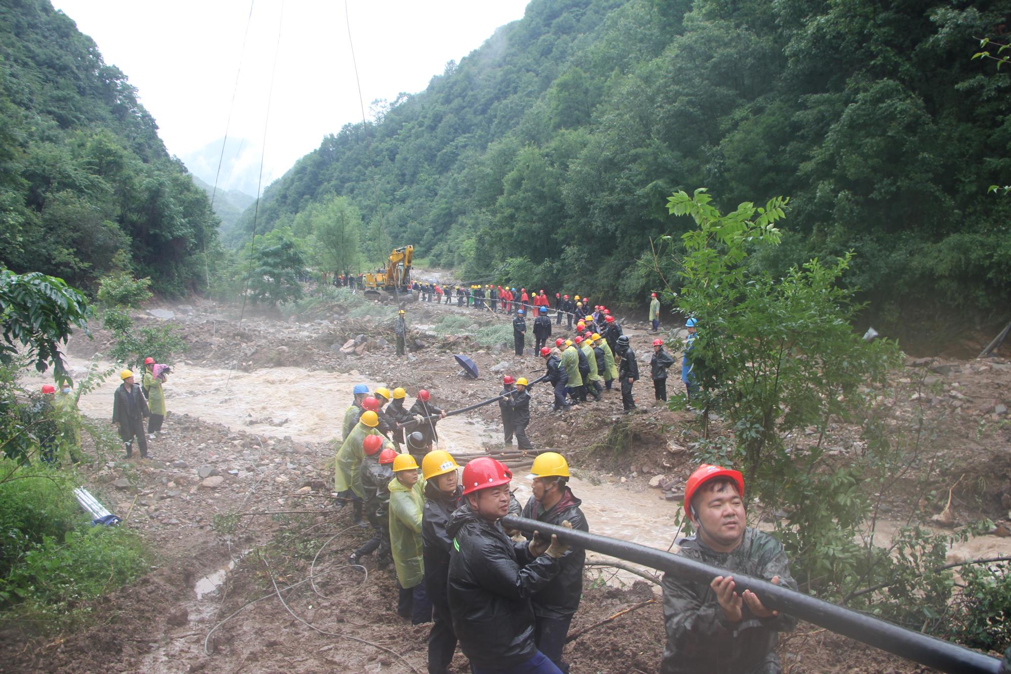 為盡快恢復礦區供電、供水、通訊等民生需求,保障礦區職工家屬的正常生活,在麻家砭水庫電力設施搶修中,150余名搶險隊員翻山越嶺,更是靠人拉肩扛將600余米電纜運送到作業現場,冒著大雨進行電纜鋪設,在水流沒過膝蓋的搶修現場連續奮戰20小時沒合眼……