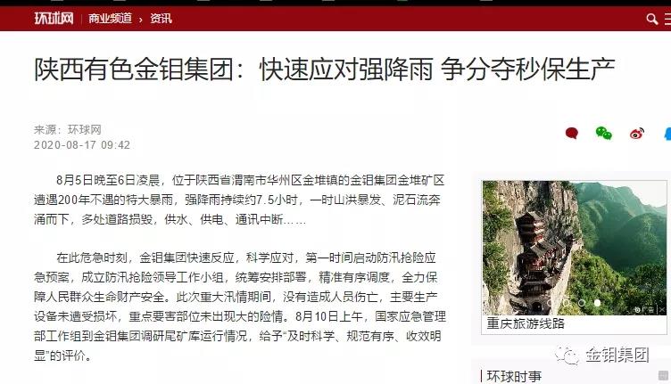 近日,經集團公司黨委宣傳部積極推薦,多家主流媒體相繼報道了《陜西有色金鉬集團:快速應對強降雨 爭分奪秒保生產》一文。包括環球網、中央廣電總臺國際在線、今日頭條網、中國經營報微能源均已收錄該文章。