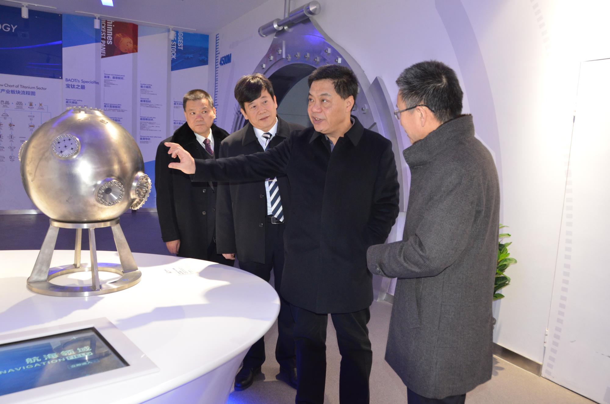 陜西有色金屬集團黨委書記、董事長馬寶平(左三)到寶鈦集團指導科技創新工作。