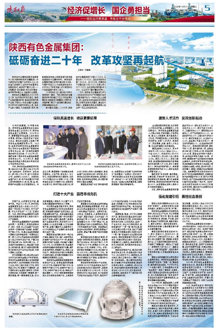 作為我國最大的以鈦及鈦合金為主的專業化稀有金屬生產科研基地,陜西有色金屬集團權屬企業寶鈦集團是世界第三、亞洲規模最大的鈦材加工企業,年加工能力突破2萬噸,擁有兩家上市公司,被譽為“中國鈦城”,是中國鈦及鈦合金國標、國軍標、行標的主要制定者,為我國第一顆氫彈、第一艘核潛艇、第一顆軟著陸衛星、4500米深潛器載人球艙及C919國產大飛機等大國重器的研制作出了貢獻。