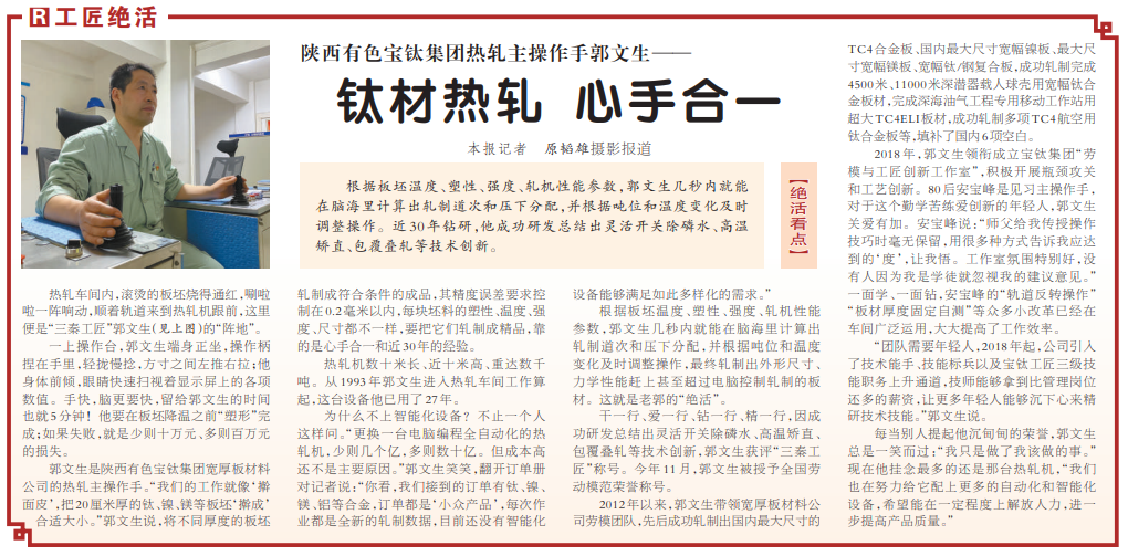 郭文生是陜西有色寶鈦集團寬厚板材料公司的熱軋主操作手。“我們的工作就像‘搟面皮’,把20厘米厚的鈦、鎳、鎂等板坯‘搟成’合適大小。”郭文生說,將不同厚度的板坯軋制成符合條件的成品,其精度誤差要求控制在0.2毫米以內,每塊坯料的塑性、溫度、強度、尺寸都不一樣,要把它們軋制成精品,靠的是心手合一和近30年的經驗。