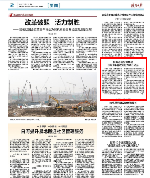 記者日前從陜西有色金屬集團獲悉:該集團2021年全年實現營業收入1618.18億元,同比增長19.86%;實現利潤總額25.15億元,同比增長226.2%,經營成效創十余年來最好成績。