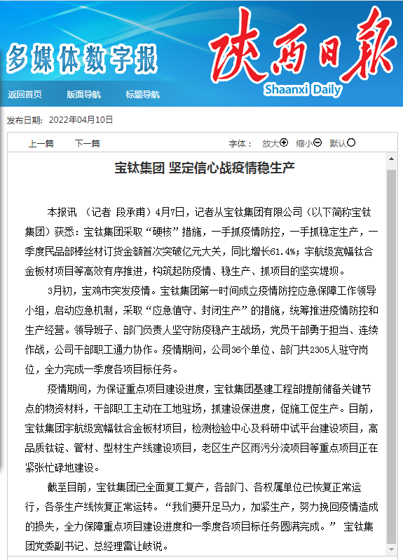 3月初,寶雞市突發疫情。寶鈦集團第一時間成立疫情防控應急保障工作領導小組,啟動應急機制,采取“應急值守、封閉生產”的措施,統籌推進疫情防控和生產經營。領導班子、部門負責人堅守防疫穩產主戰場,黨員干部勇于擔當、連續作戰,公司干部職工通力協作。疫情期間,公司36個單位、部門共2305人駐守崗位,全力完成一季度各項目標任務。