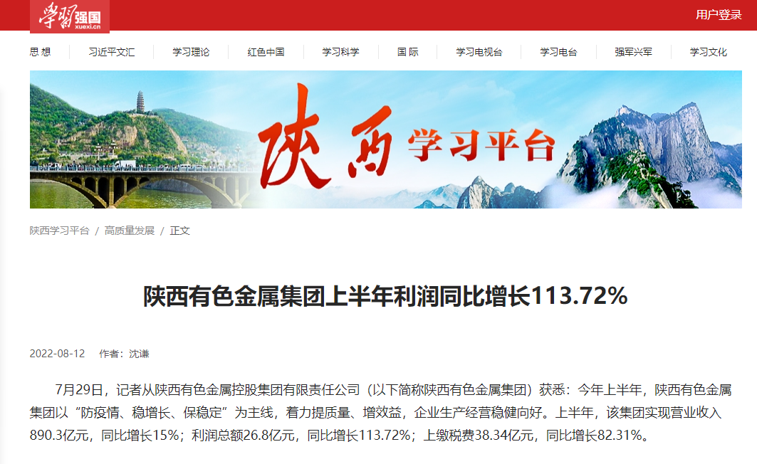 7月29日,記者從陜西有色金屬控股集團有限責任公司(以下簡稱陜西有色金屬集團)獲悉:今年上半年,陜西有色金屬集團以“防疫情、穩增長、保穩定”為主線,著力提質量、增效益,企業生產經營穩健向好。上半年,該集團實現營業收入890.3億元,同比增長15%;利潤總額26.8億元,同比增長113.72%;上繳稅費38.34億元,同比增長82.31%。