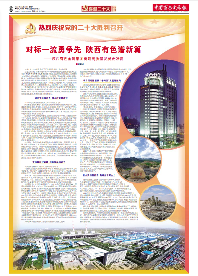 砥柱中流展雄風。作為陜西省國資系統創建世界一流企業的兩家省屬企業之一,陜西有色金屬集團將全要素對標創建世界一流企業,以更強實力夯實發展根基、以更大魄力推動項目加力提速、以更優制度提升企業品質、以更深責任履行社會擔當,為奮力譜寫陜西高質量發展新篇章、為建設有色金屬工業強國作出新的更大貢獻。