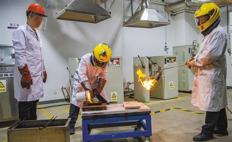 11月11日,在陜西黃金集團西安秦金有限責任公司熔煉車間,員工正在制作黃金產品。據悉,今年前10月,該公司實現營業收入20.07億元。本報記者 袁景智攝