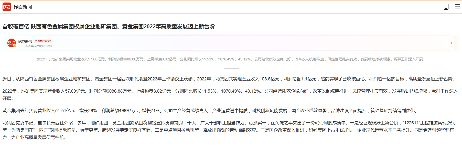 近日,從陜西有色金屬集團權屬企業地礦集團、黃金集團一屆四次職代會暨2023年工作會議上獲悉,2022年,兩集團共實現營業收入108.6億元,利潤總額1.1億元,超前實現了營收破百億、利潤超一億的目標,高質量發展邁上新臺階。