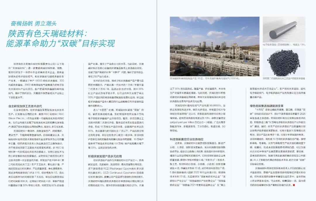 陜西有色天宏瑞科硅材料有限責任公司(以下簡稱“天瑞硅材料”)是一家集超純硅材料制造、銷售、服務和研發于一體的中外合資高新技術企業,具有全球領先的電子級硅烷氣、粒狀多晶硅與超純多晶硅生產技術,一期建成了年產18000噸粒狀多晶硅、300噸超純多晶硅、2000噸高純硅烷氣裝載能力的電子及光伏新材料產業化項目,生產的超純多晶硅和高純硅烷氣,填補了國內空白,大幅提升陜西省相關產業鏈上下游配套水平。