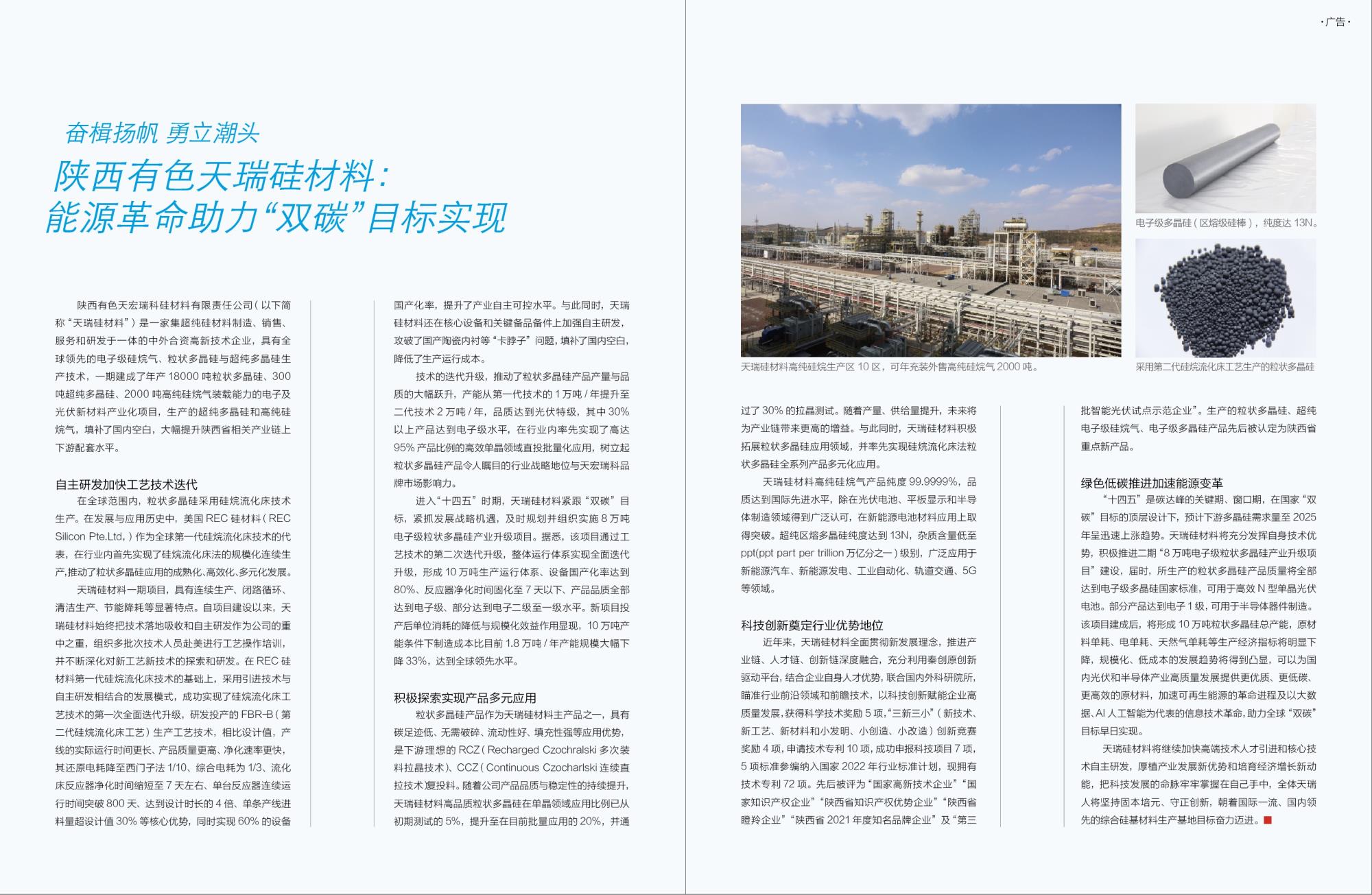 陜西有色天宏瑞科硅材料有限責任公司(以下簡稱“天瑞硅材料”)是一家集超純硅材料制造、銷售、服務和研發于一體的中外合資高新技術企業,具有全球領先的電子級硅烷氣、粒狀多晶硅與超純多晶硅生產技術,一期建成了年產18000噸粒狀多晶硅、300噸超純多晶硅、2000噸高純硅烷氣裝載能力的電子及光伏新材料產業化項目,生產的超純多晶硅和高純硅烷氣,填補了國內空白,大幅提升陜西省相關產業鏈上下游配套水平。