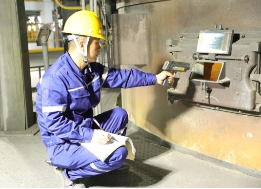 在金鉬集團冶煉分公司焙燒鉬精礦生產線上,王飛正在多膛爐觀察口前曲著腿、彎著腰,察看入爐原料的反應情況