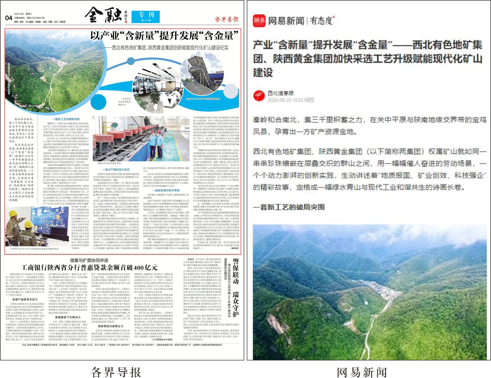 近日,人民數字聯播網、環球時報、中華網、中宏網、陜西日報、群眾新聞網、中國有色金屬報、西北信息報、各界導報等十余家中、省主流媒體,分別以《產業“含新量”提升發展“含金量”——西北有色地礦集團、陜西黃金集團加快采選工藝升級賦能現代化礦山建設》《陜西礦山企業積極推進綠色礦山建設,實現生態、經濟和社會效益有機統一——采礦不“見”礦 礦在綠中藏》為題,紛紛聚焦兩集團在統籌推進科技創新、產業創新,因地制宜加快采選工藝升級,賦能現代化礦山建設方面的新進展、新成效。