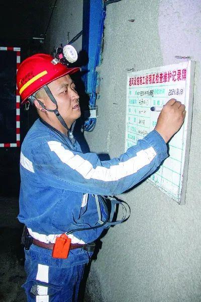 圖為:劉栓銀正在填寫通風設施檢查記錄牌板