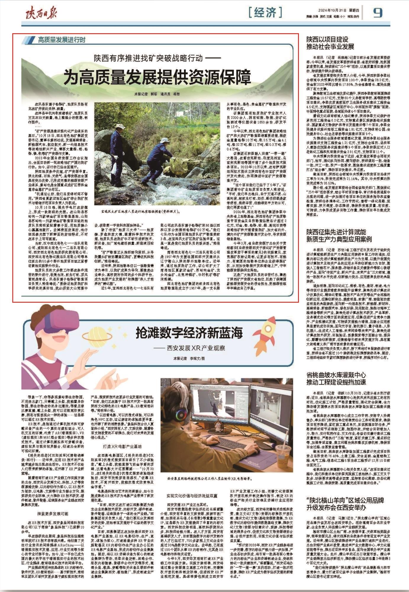 2024年,西北有色地礦集團爭取中央和省上地勘基金、陜西有色礦產地質勘查專項資金及自投勘查經費總計超過2億元,對金、鉬、鉛鋅、鈷、銅、高純石英等戰略性礦種開展普查找礦,加大省內外、境內外礦產資源勘查開發合作,尋求資源儲備基地。
