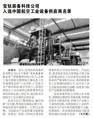 中國有色金屬報(bào):寶鈦裝備科技公司入選中國航空工業(yè)設(shè)備供應(yīng)商名錄