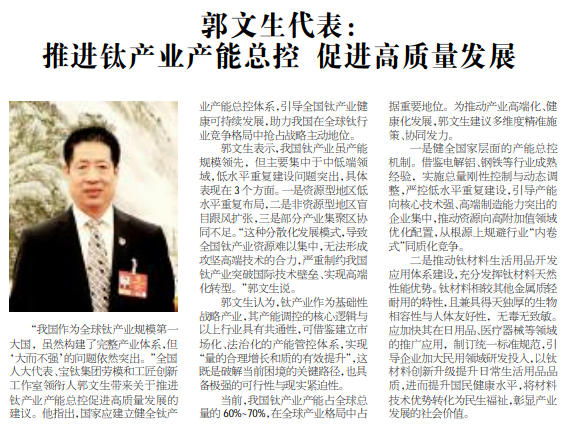 “我國作為全球鈦產(chǎn)業(yè)規(guī)模第一大國,雖然構(gòu)建了完整產(chǎn)業(yè)體系,但‘大而不強’的問題依然突出?!比珖舜蟠?、寶鈦集團勞模和工匠創(chuàng)新工作室領(lǐng)銜人郭文生帶來關(guān)于推進鈦產(chǎn)業(yè)產(chǎn)能總控促進高質(zhì)量發(fā)展的建議。他指出,國家應建立健全鈦產(chǎn)業(yè)產(chǎn)能總控體系,引導全國鈦產(chǎn)業(yè)健康可持續(xù)發(fā)展,助力我國在全球鈦行業(yè)競爭格局中搶占戰(zhàn)略主動地位。