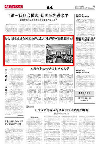 中國有色金屬報:寶鈦集團通過全國工業(yè)產(chǎn)品鈦材生產(chǎn)許可證換證審查