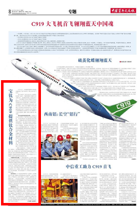 國產商用大飛機C919在上海浦東機場首飛成功,貢獻智慧和力量的企業為數眾多,寶鈦集團有限公司就是其中之一。寶鈦集團不僅是中國商用飛機有限責任公司大型客機C919項目鈦材的首選供應商,也是國內唯一合格供應商。寶鈦集團作為中國鈦材市場占有率、市場認知度、鈦加工材產量最大的專業研制生產鈦及鈦合金材料的企業,先后直接和間接為國產大型客機C919研制生產多種規格鈦合金材料21項,保障供應了鈦合金板材、棒材、管材、鍛件等130余噸。