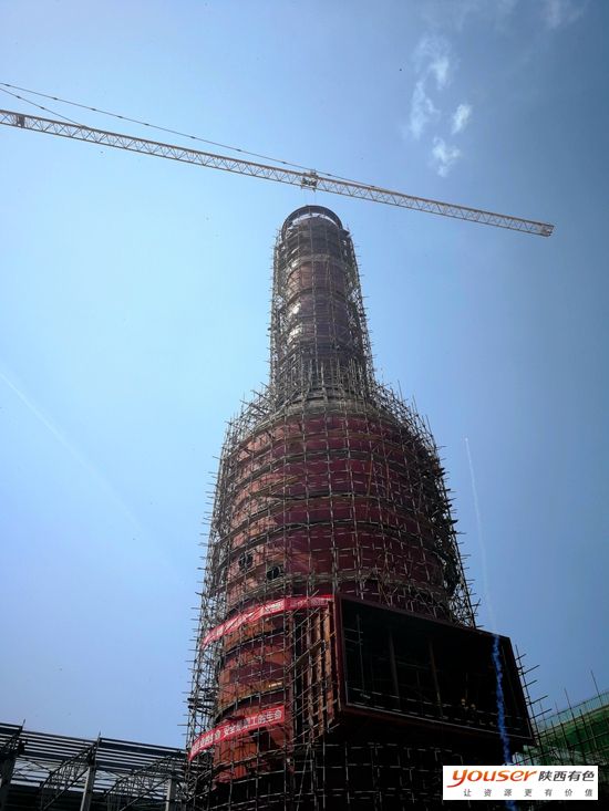 建設(shè)中的脫硫塔,吸收塔和煙囪合二為一,形似一個(gè)大啤酒瓶