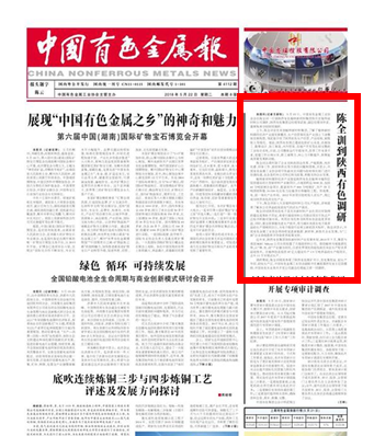 5月15日,中國有色金屬工業協會會長陳全訓一行到陜西有色榆林新材料集團和天宏瑞科硅材料公司調研。陜西有色集團總經理鄒武裝、副總經理劉學武、董事陳濤分別陪同。