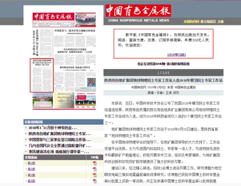 中國有色金屬報:陜西有色地礦集團地球物理院士專家工作站入選2018年模范院士專家工作站