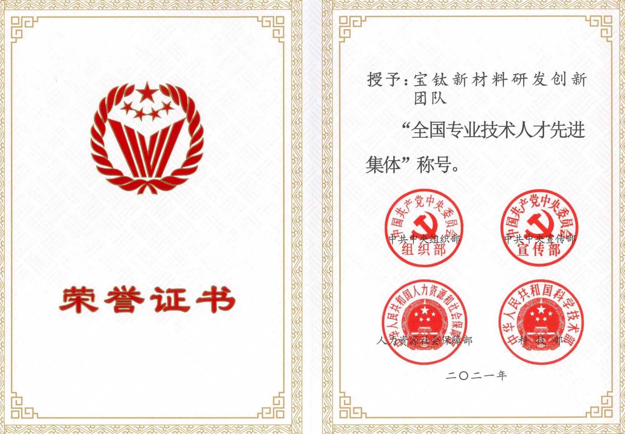 全國杰出專業(yè)技術(shù)人才及集體評選表彰由中共中央組織部、中共中央宣傳部、人力資源社會保障部、科技部聯(lián)合組織實施,每5年開展一次。此次獲得表彰的全國專業(yè)技術(shù)人才先進(jìn)集體同時有鐘南山呼吸疾病防控團隊、殲-15飛機研制團隊等杰出人才集體,均為我國廣大專業(yè)技術(shù)人才的優(yōu)秀代表。2021年5月,在省人社廳、省國資委大力支持下,由陜西有色金屬集團組織申報,寶鈦新材料研發(fā)創(chuàng)新團隊與全省眾多優(yōu)秀企業(yè)科研團隊同臺競爭,經(jīng)過艱苦努力,沖出重圍,取得代表全省企業(yè)參與國家評選的唯一名額,最終在國家四部委聯(lián)合評選中脫穎而出。