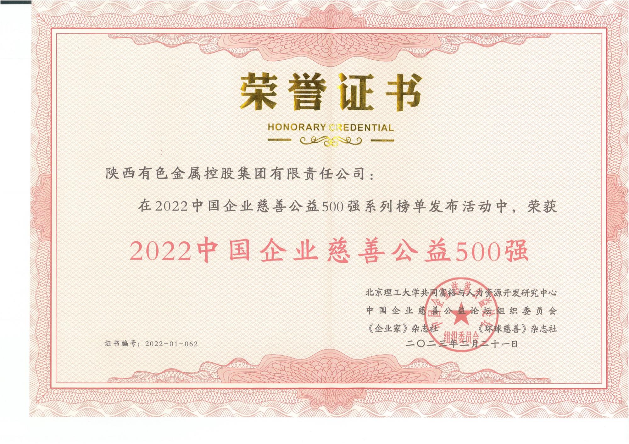 近日,2022中國(guó)企業(yè)慈善公益500強(qiáng)發(fā)布暨第六屆中國(guó)企業(yè)慈善公益論壇在重慶涪陵舉行,陜西有色金屬集團(tuán)榮獲“2022中國(guó)企業(yè)慈善公益500強(qiáng)”稱(chēng)號(hào)。