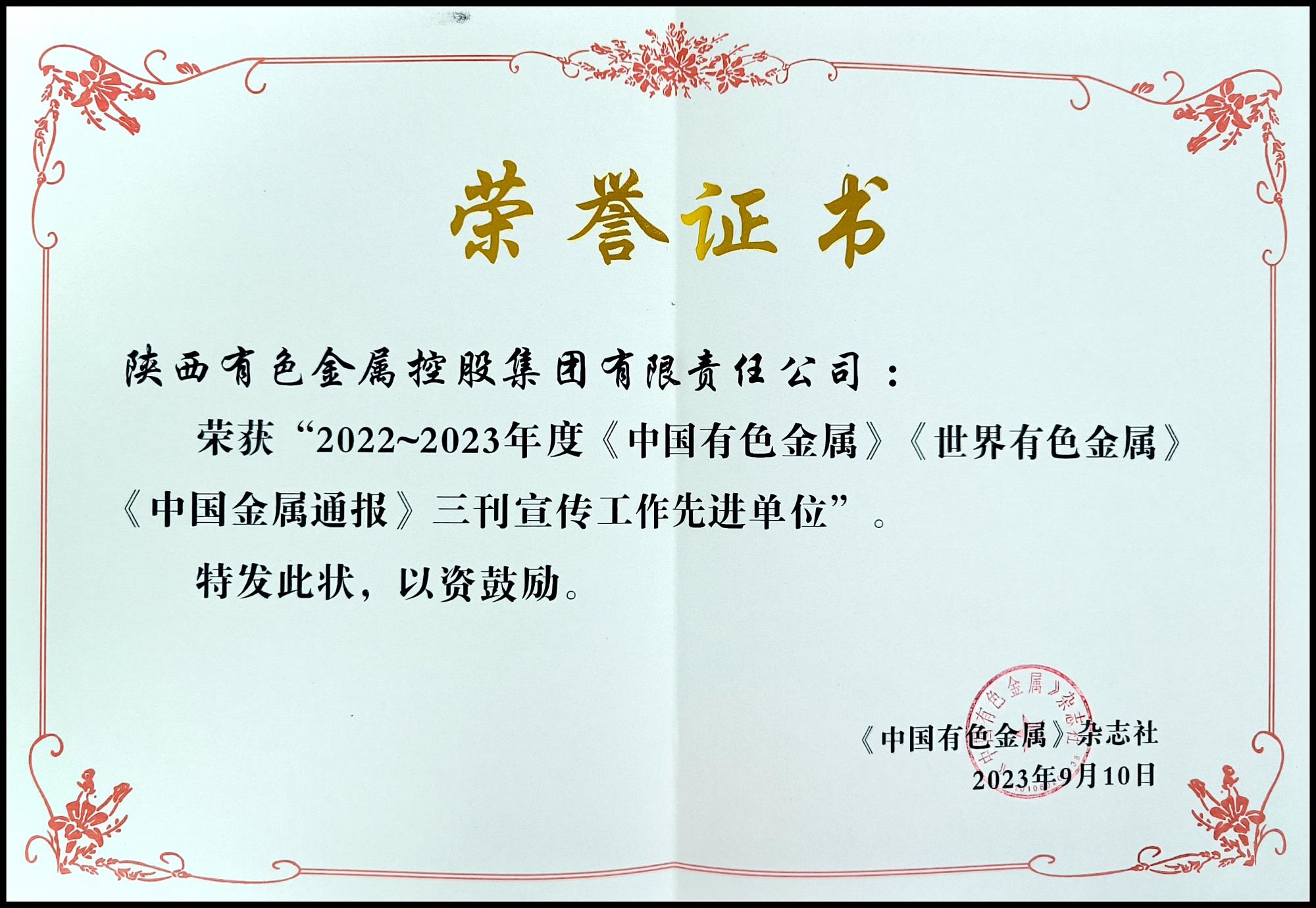 9月21日至22日,2023年《中國(guó)有色金屬》《世界有色金屬》《中國(guó)金屬通報(bào)》三刊特約通訊員、《中國(guó)有色金屬工業(yè)年鑒》撰稿人工作會(huì)在烏魯木齊市召開(kāi)。會(huì)議表彰了2022—2023年度宣傳工作先進(jìn)單位,陜西有色金屬集團(tuán)被《中國(guó)有色金屬》雜志社評(píng)為“宣傳工作先進(jìn)單位”。