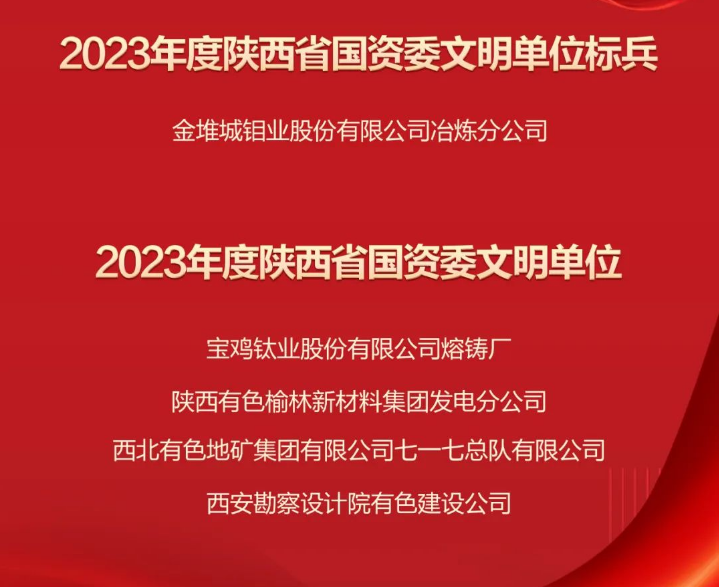 近日,陜西省國資委黨委命名表彰了2023年度陜西省國有企業(yè)文明單位(標兵),陜西有色金屬集團5家單位上榜。其中,金堆城鉬業(yè)股份有限公司冶煉分公司榮獲“2023年度陜西省國資委文明單位標兵”稱號,寶雞鈦業(yè)股份有限公司熔鑄廠、陜西有色榆林新材料集團發(fā)電分公司榮獲“2023年度陜西省國資委文明單位”稱號,西北有色地礦集團有限公司七一七總隊有限公司、西安勘察設計院有色建設公司通過復審繼續(xù)保留“陜西省國資委文明單位”稱號。