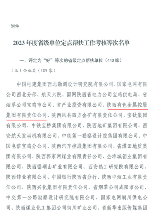 近日,陜西省農(nóng)業(yè)農(nóng)村廳印發(fā)《關于2023年度省級單位定點幫扶工作考核結果的通報》(陜農(nóng)發(fā)〔2024〕39號),對2023年度全省定點幫扶工作考核結果進行通報,陜西有色金屬集團被評為省級定點幫扶“好”等次單位,在進入鞏固脫貧攻堅成果同鄉(xiāng)村振興有效銜接期連續(xù)三年獲此殊榮。