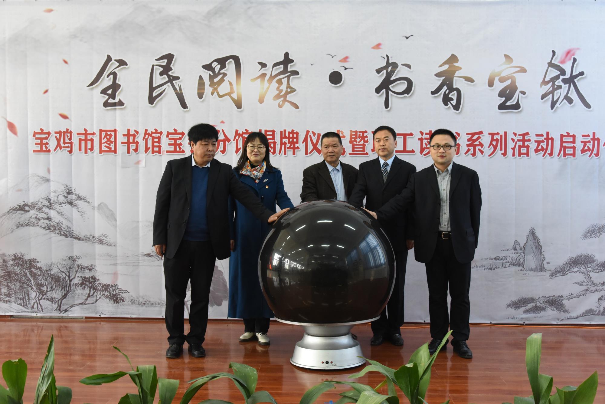 儀式上,王建超和劉掌全為寶雞市圖書館寶鈦分館揭牌。王建超、賀治民、薛凱、侯文波、劉掌全共同手扶水晶啟動球,正式啟動寶鈦集團(tuán)“全民閱讀?書香寶鈦”職工讀書系列活動。