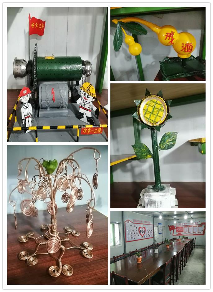 此外,磨選車間還利用業(yè)余時間,把現(xiàn)有的活動板房改造成員工之家,用完全報廢的鋼球、齒輪、鐵絲頭兒制作成一個個小工藝品進行展示,既美化了工作生活環(huán)境,又激發(fā)了職工發(fā)明創(chuàng)造的新思路。