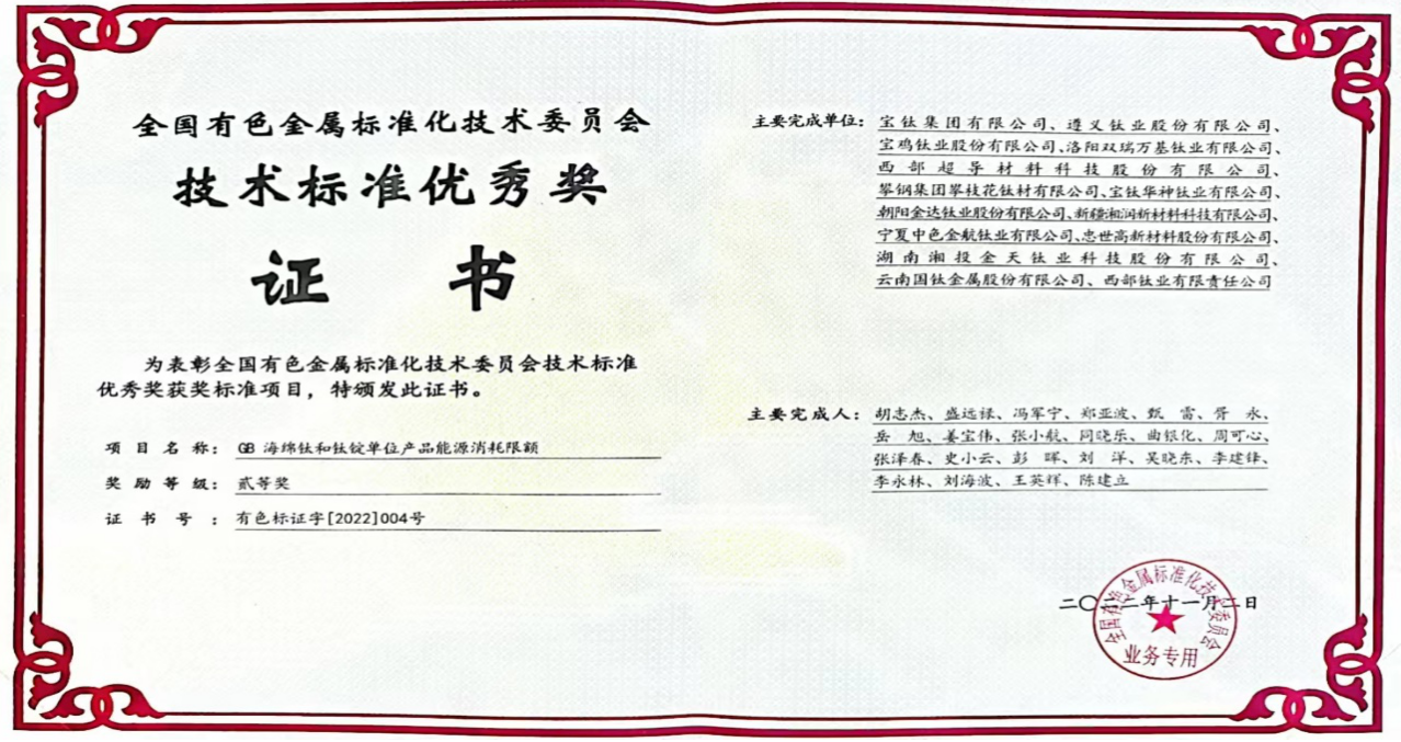 近日,2022年度全國有色金屬標準化技術(shù)委員會年會發(fā)布了全國有色金屬領(lǐng)域技術(shù)標準獲獎名單。由寶鈦集團主持制定的強制性國家標準《海綿鈦和鈦錠單位產(chǎn)品能源消耗限額》榮獲“全國有色金屬標準化技術(shù)委員會技術(shù)標準優(yōu)秀獎”。