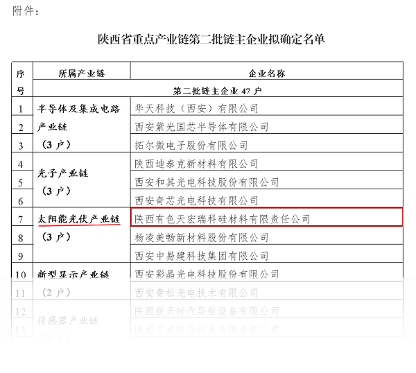 2023年6月6日,陜西省工業(yè)和信息化廳對陜西省重點產(chǎn)業(yè)鏈第二批鏈主企業(yè)擬確定名單進(jìn)行了公示,陜西有色天宏瑞科硅材料有限責(zé)任公司成功入選太陽能光伏產(chǎn)業(yè)鏈鏈主企業(yè)。