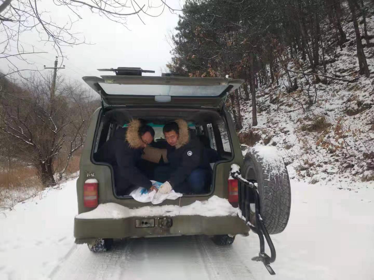 劉斌(右一)和駐村工作隊拋灑消雪劑,方便群眾安全出行