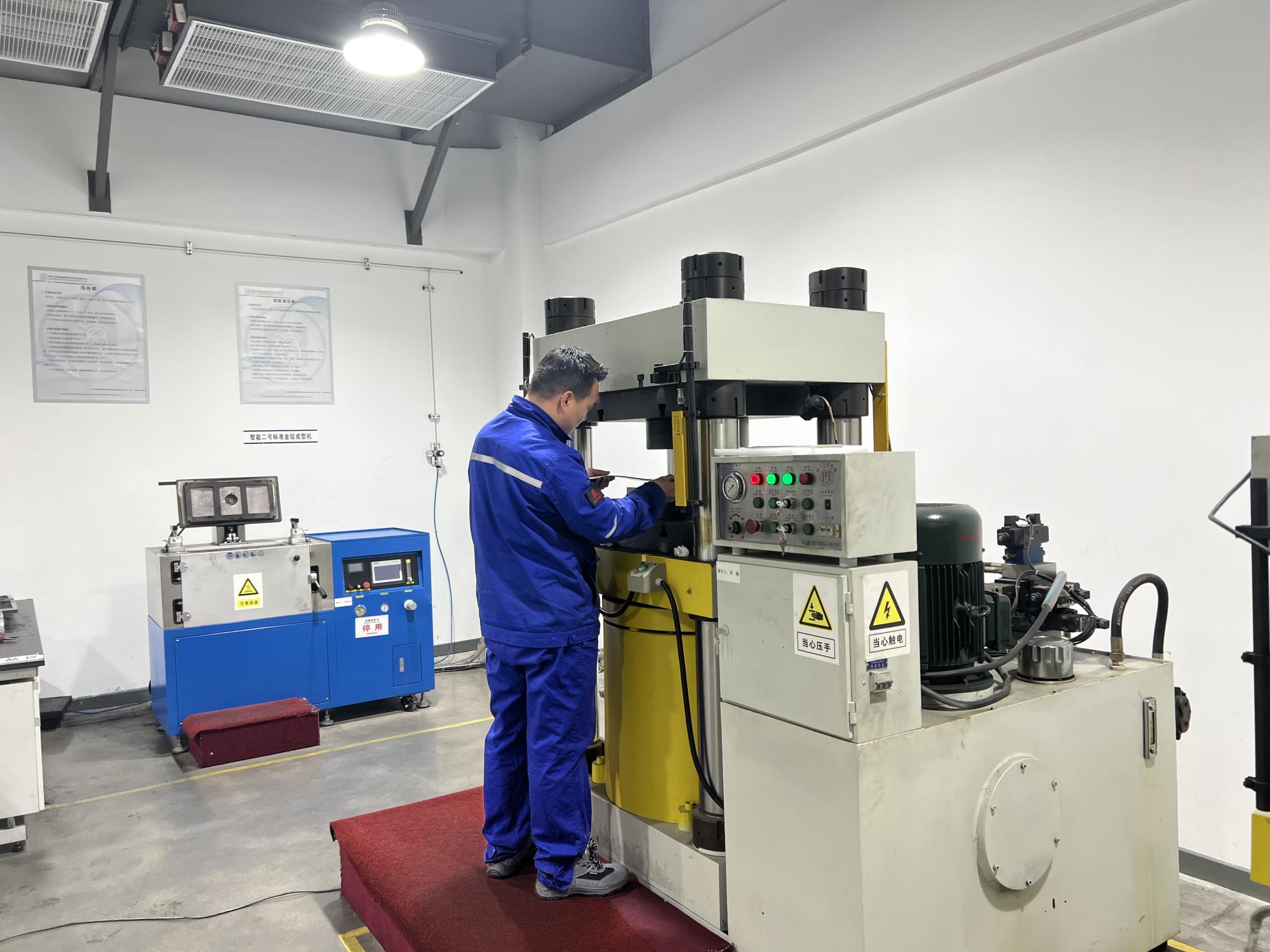 生產人員在四柱油壓機前進行黃金制坯工藝