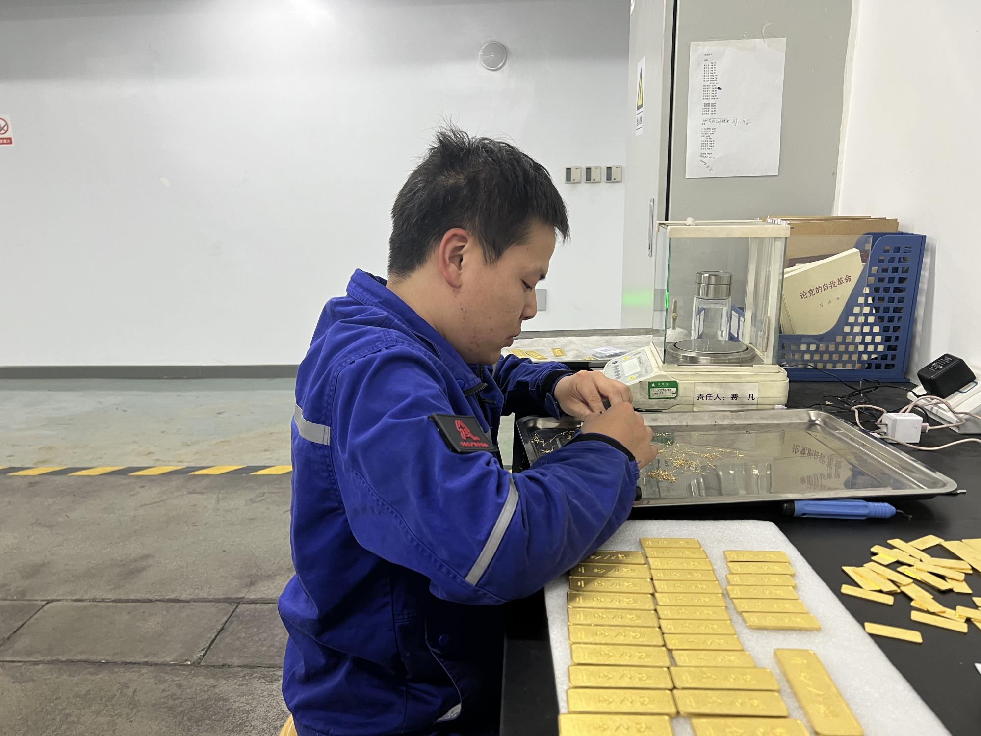 生產人員對黃金工藝品進行“找重”程序
