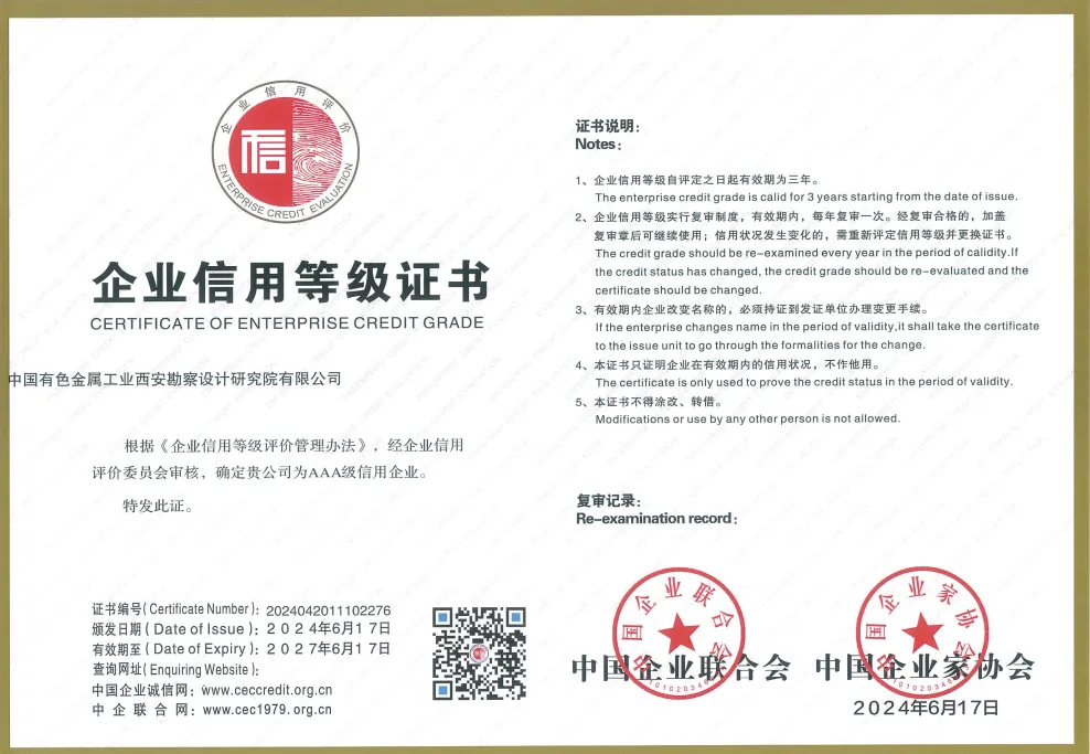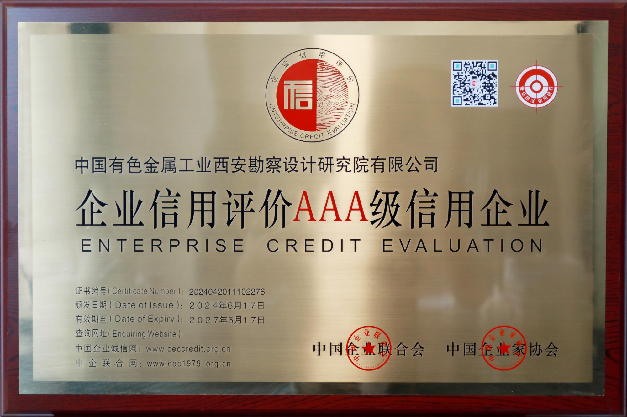 近日,西安勘察設計院榮獲由中國企業(yè)聯(lián)合會和中國企業(yè)家協(xié)會頒發(fā)的2024年企業(yè)信用評價AAA級信用企業(yè)稱號,為國家企業(yè)信用評價最高等級。