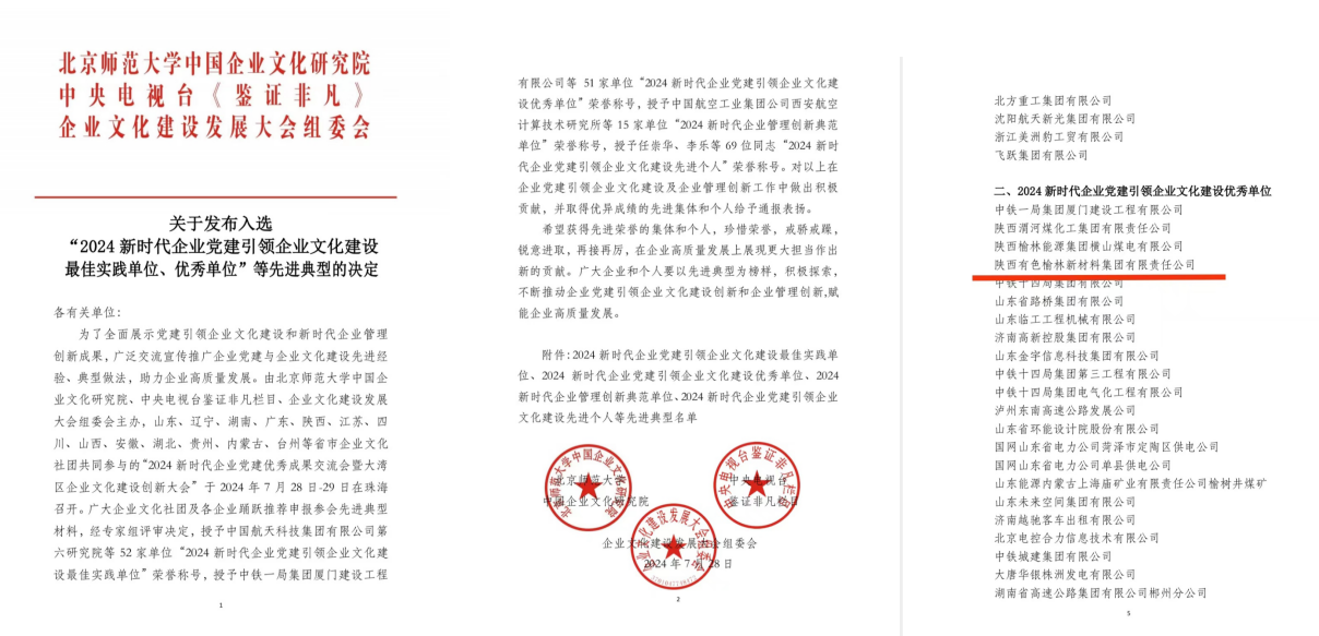 榆林新材料集團(tuán)榮獲2024 新時(shí)代企業(yè)黨建引領(lǐng)企業(yè)文化建設(shè)優(yōu)秀單位