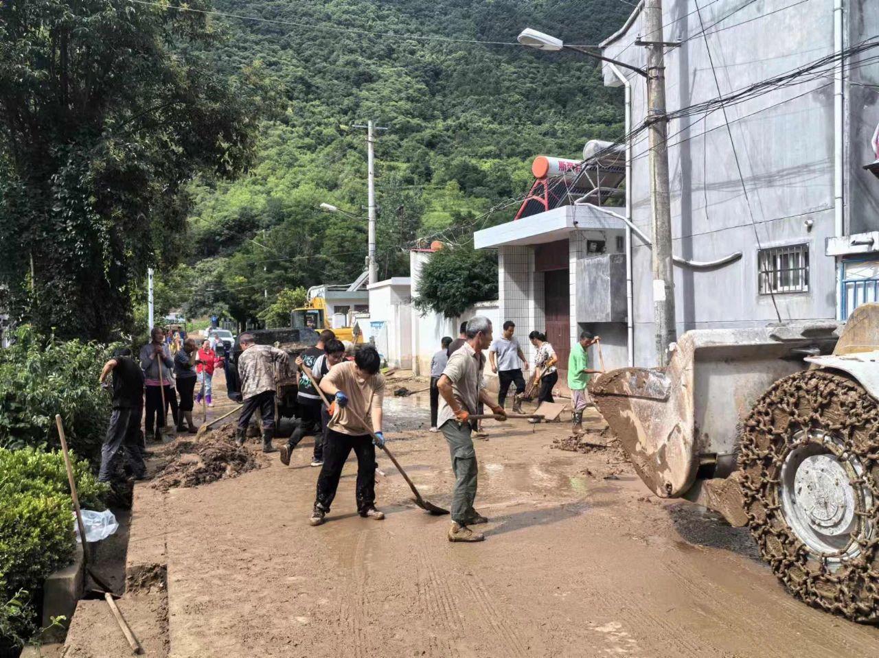 7月20日,四方金礦組織搶險隊員,調配工程機械抵達現(xiàn)場,幫助孔棺村參搶險和清淤。