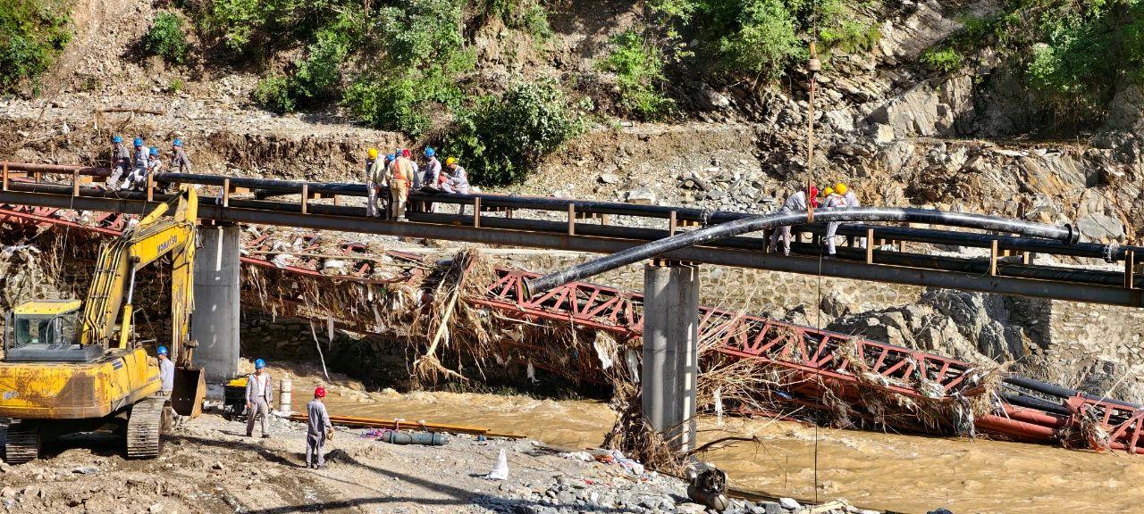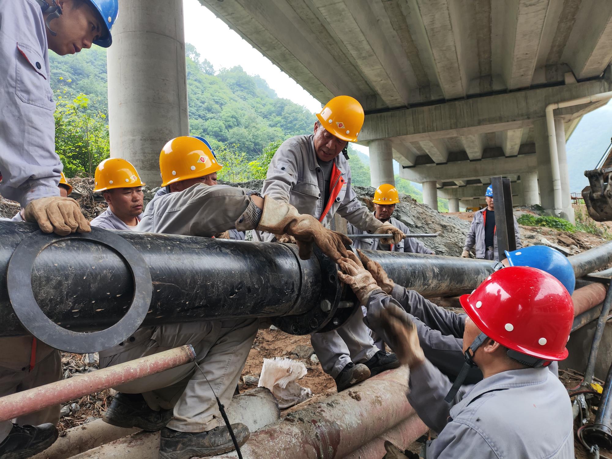 7月25日,四方金礦職工正在河道上架設受損的尾礦管道。