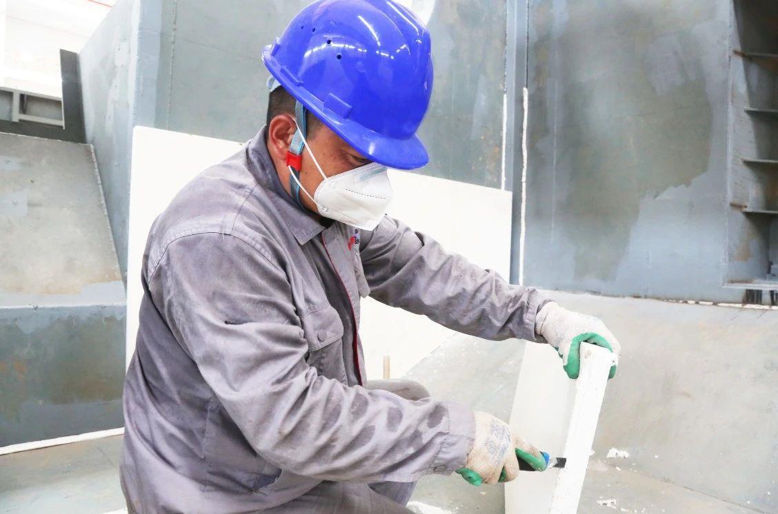 工人正在裁切熔保爐背襯板