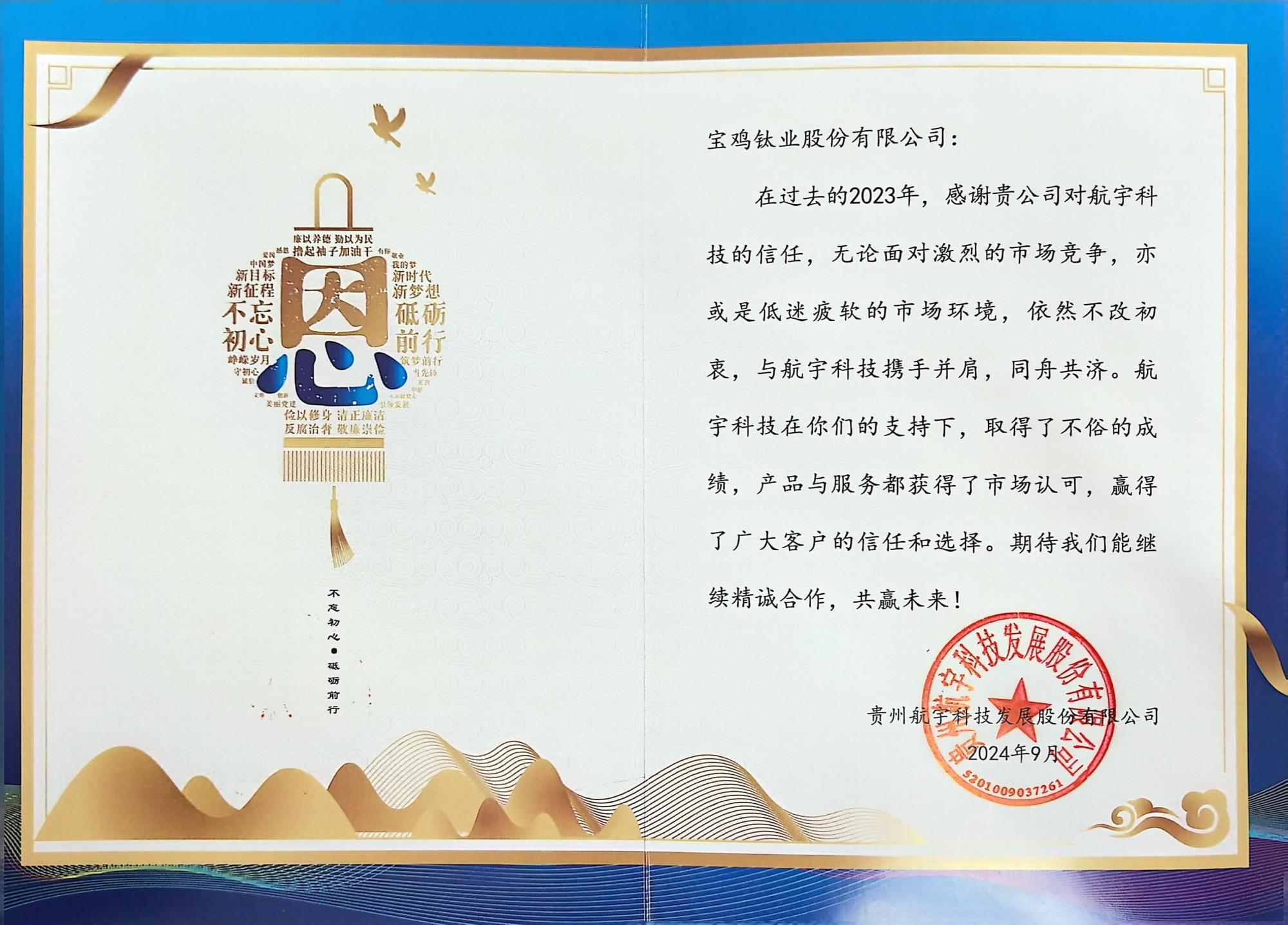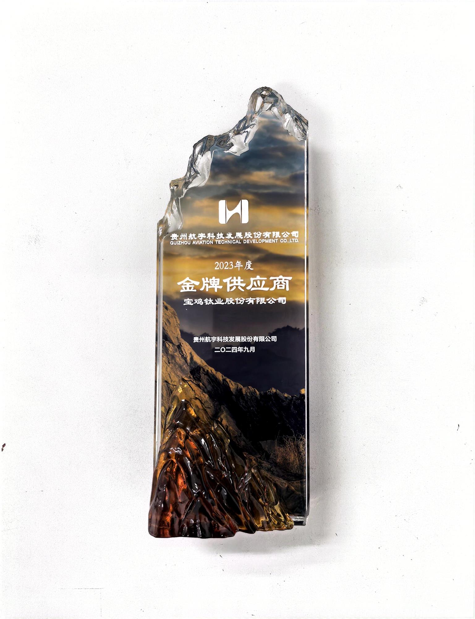 貴州航宇是我國(guó)大型航空航天環(huán)鍛件重點(diǎn)生產(chǎn)制造企業(yè),為我國(guó)多型航空、航天發(fā)動(dòng)機(jī)進(jìn)行環(huán)鍛件配套生產(chǎn),是寶鈦股份重點(diǎn)核心用戶之一。2023年,面對(duì)激烈的市場(chǎng)競(jìng)爭(zhēng),寶鈦股份在產(chǎn)品技術(shù)質(zhì)量要求不斷提高、交付壓力不斷增大的情況下,克服諸多困難,加強(qiáng)合作交流,保質(zhì)保量完成了交付任務(wù),為貴州航宇順利完成年度計(jì)劃發(fā)揮了至關(guān)重要的作用。近期,貴州航宇根據(jù)其供應(yīng)商管理規(guī)定,從質(zhì)量、交付、服務(wù)等方面對(duì)2023年度供應(yīng)商進(jìn)行績(jī)效評(píng)價(jià),寶鈦股份因突出的產(chǎn)品和服務(wù)質(zhì)量,被評(píng)為2023年度“金牌供應(yīng)商”。