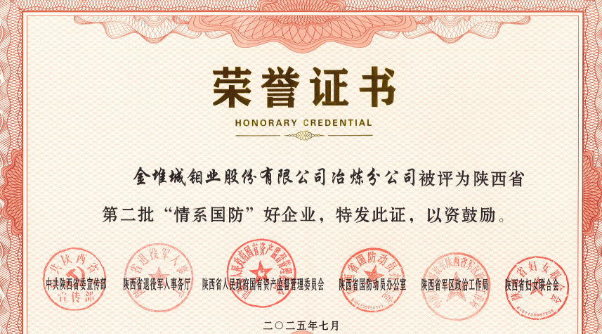金鉬股份冶煉分公司榮獲陜西省第二批“情系國防”好企業(yè)
