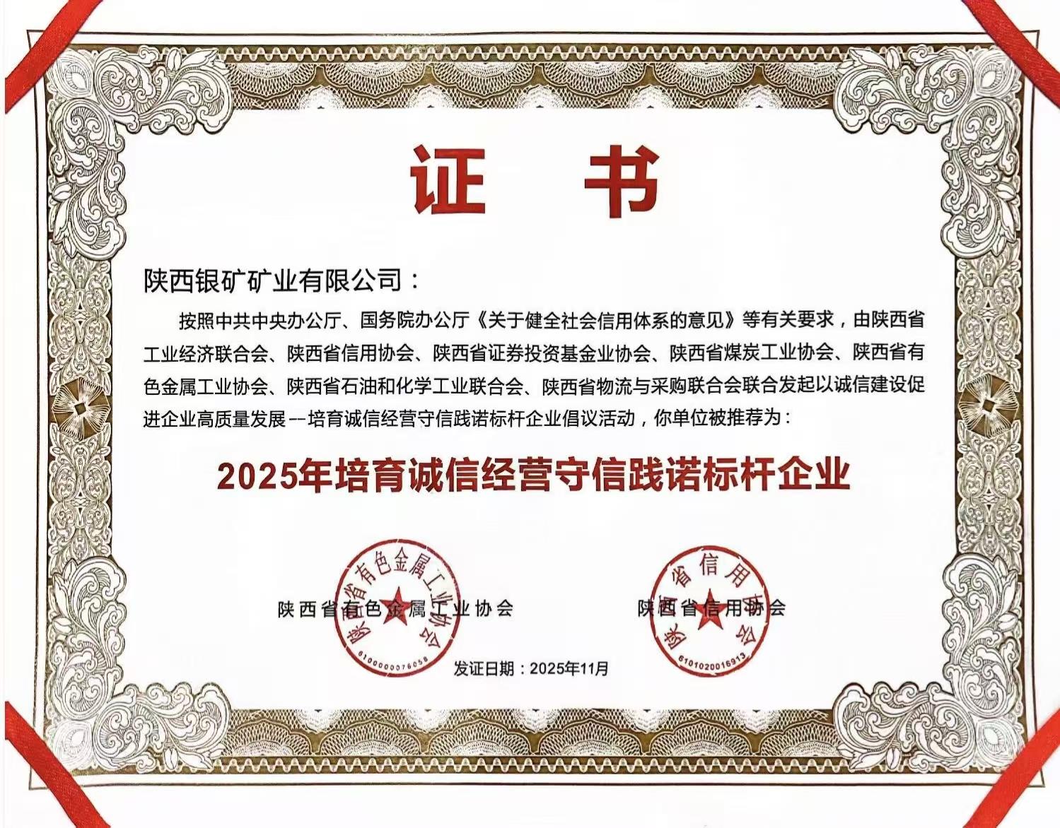 近日,陜西銀礦礦業(yè)有限公司被陜西省有色金屬工業(yè)協(xié)會與陜西省信用協(xié)會聯(lián)合評為“2025年培育誠信經(jīng)營守信踐諾標桿企業(yè)”。這一榮譽標志著陜西銀礦在誠信體系建設領域的成果獲得行業(yè)與信用管理權威機構的雙重認可。