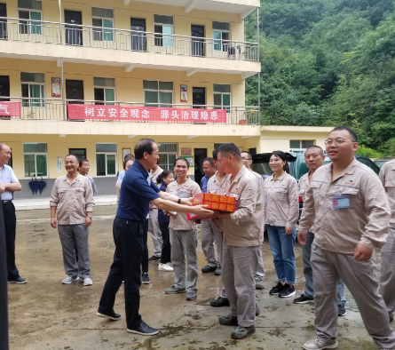 8月9日的商洛,中到大雨,空氣濕悶。魏俊英一行首先驅車到達山陽秦金公司,看望慰問了一線員工,發放了清涼物品。對公司員工在企業困頓情況下依然忠于職守的精神風貌給予贊許。之后馬不停蹄地趕往山陽秦鼎公司。