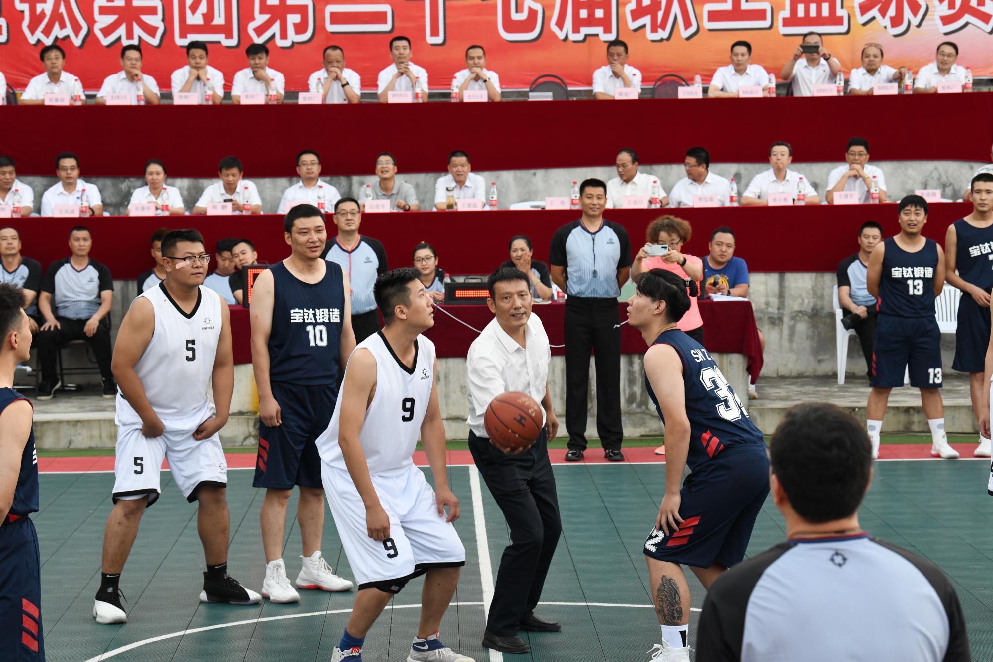 8月13日晚7時,由寶鈦集團工會舉辦的第二十七屆職工籃球賽在老區(qū)燈光籃球場拉開帷幕,公司權(quán)屬15家單位15支代表隊180多名運動員將在這里進行為期12天的比賽。公司黨委副書記、工會主席王建超,副總經(jīng)理、寶雞籃球協(xié)會副主席王儉,工會副主席田周平及本屆組委會成員、公司工會各部門負責人、寶鈦籃球協(xié)會成員及各參賽單位領(lǐng)隊參加了開幕式。