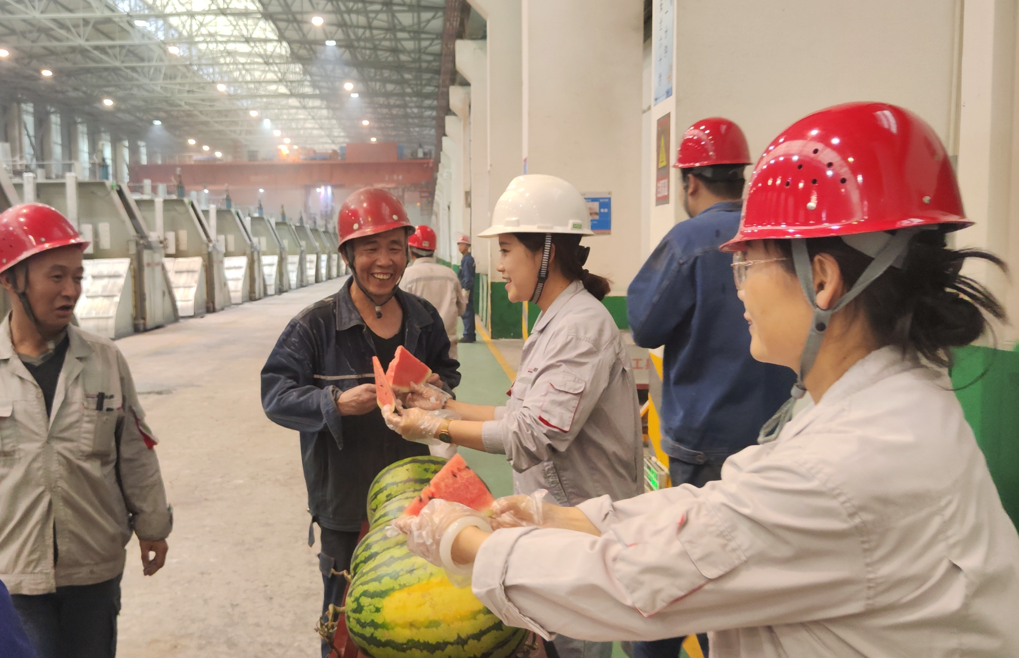 “師傅,辛苦了!來,吃塊西瓜解解暑。高溫天氣再加上高溫的工作環(huán)境,一定要多補(bǔ)充水分,做好防暑降溫工作,照顧好自己的身體......”