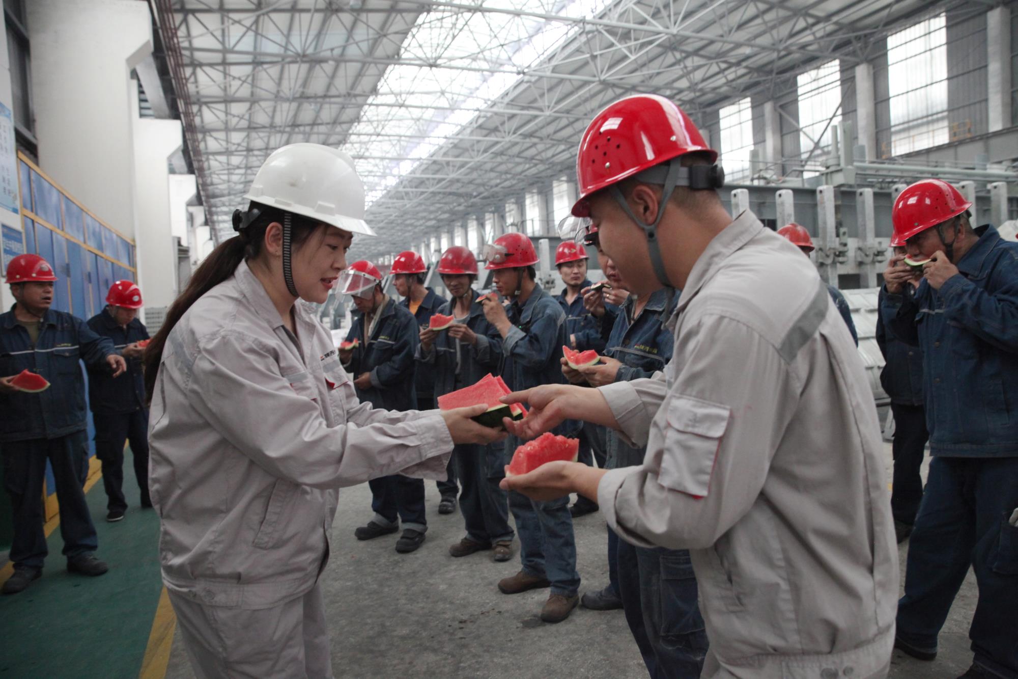 連日來驕陽似火,高溫天氣持續(xù)籠罩,陜西美鑫鋁鎂合金分公司生產(chǎn)一線一派繁忙景象,“奮戰(zhàn)二季度 實(shí)現(xiàn)雙過半”活動(dòng)正如火如荼的進(jìn)行著。陜西美鑫公司女工委積極響應(yīng)公司黨政號(hào)召,6月14日下午,在鋁鎂合金分公司電解一、二車間開展“戰(zhàn)酷暑、保安全 與一線職工肩并肩”夏季送清涼活動(dòng),為奮戰(zhàn)在高溫一線的職工送去一絲清涼和一份關(guān)懷。